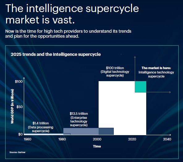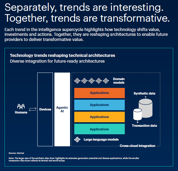 The $100 trillion opportunity. Gartner frames this moment as the next great supercycle, dwarfing previous ones like enterprise computing and data processing. We’re transitioning into a digital economy where the intelligence layer — synthetic data, large language models, domain-specific AI — becomes the primary value driver. Companies that understand this shift will stop seeing AI as a product and start seeing it as infrastructure.