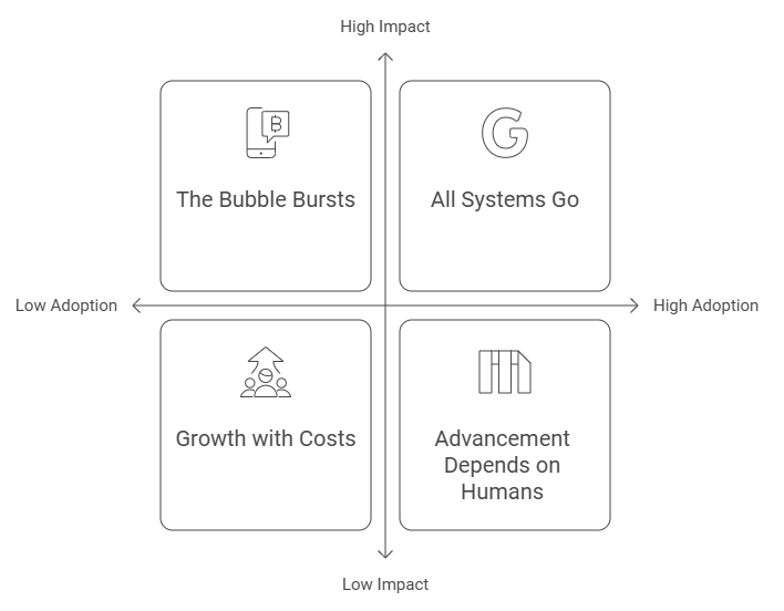 Here, GenAI fails to meet its high expectations, leading to disillusionment as inaccuracies in outputs impact critical decisions and limit operational gains. Workforce reductions amplify frustration, and businesses find themselves backtracking on AI investments. Organizations may need to rethink how they manage expectations and refine the technology’s applications to avoid dependency on underperforming AI solutions.Advancement Depends on Humans